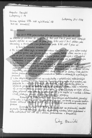 Rukopisná stížnost Augustina Navrátila adresovaná Okresní správě SNB, oddělení vyšetřování VB, leden 1978.
