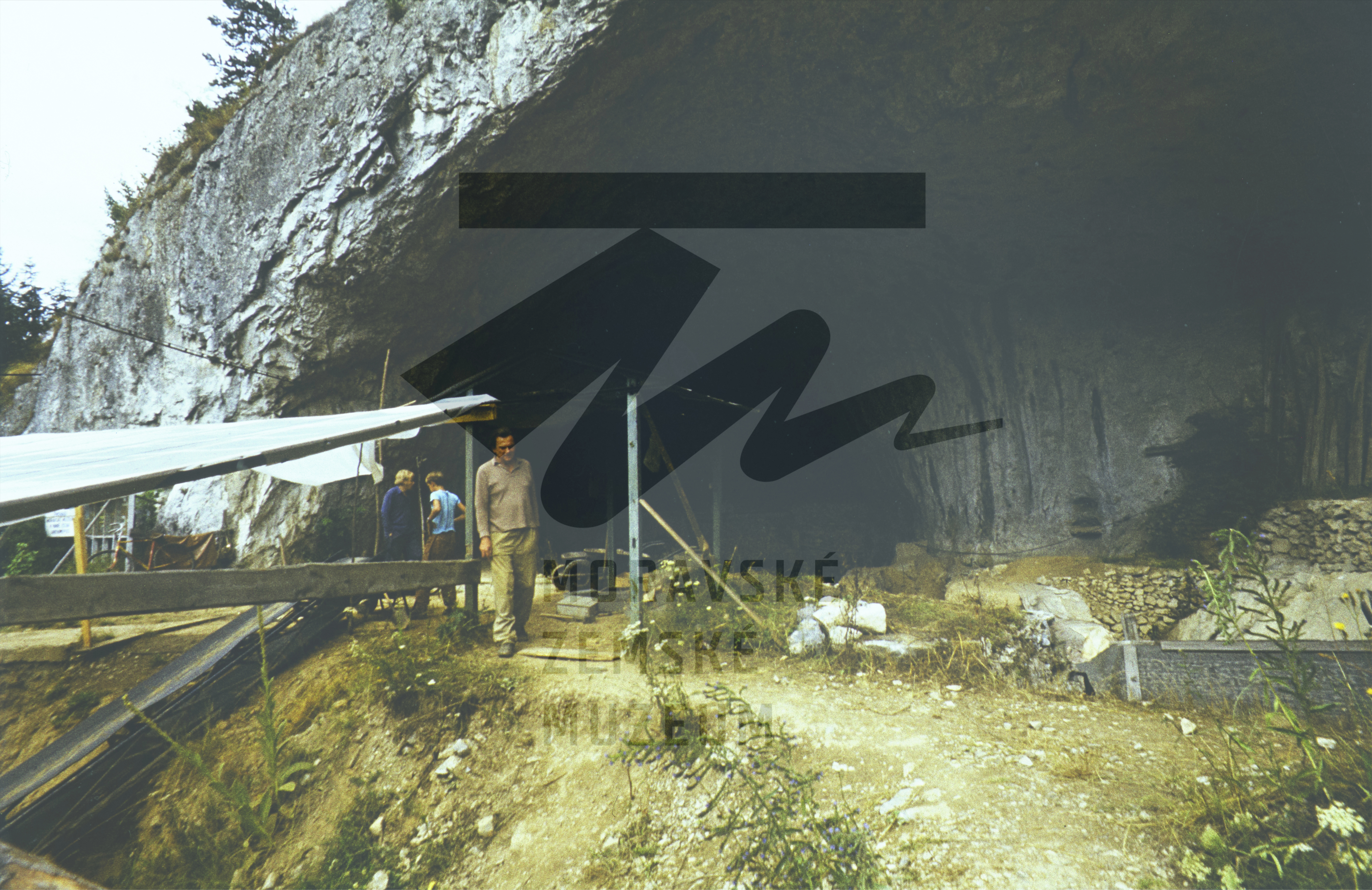 Výzkum v předpolí jeskyně (jižní portál); v hnědé košili K. Valoch. Diapozitiv, 1976.