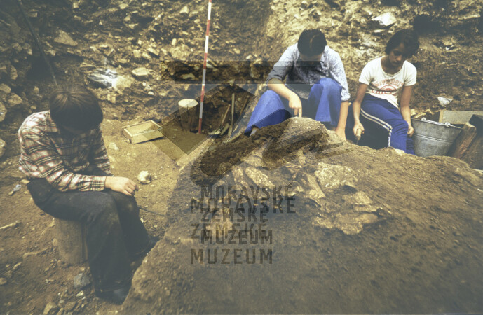 Výzkum v předpolí jeskyně (jižní portál). Diapozitiv 1976.