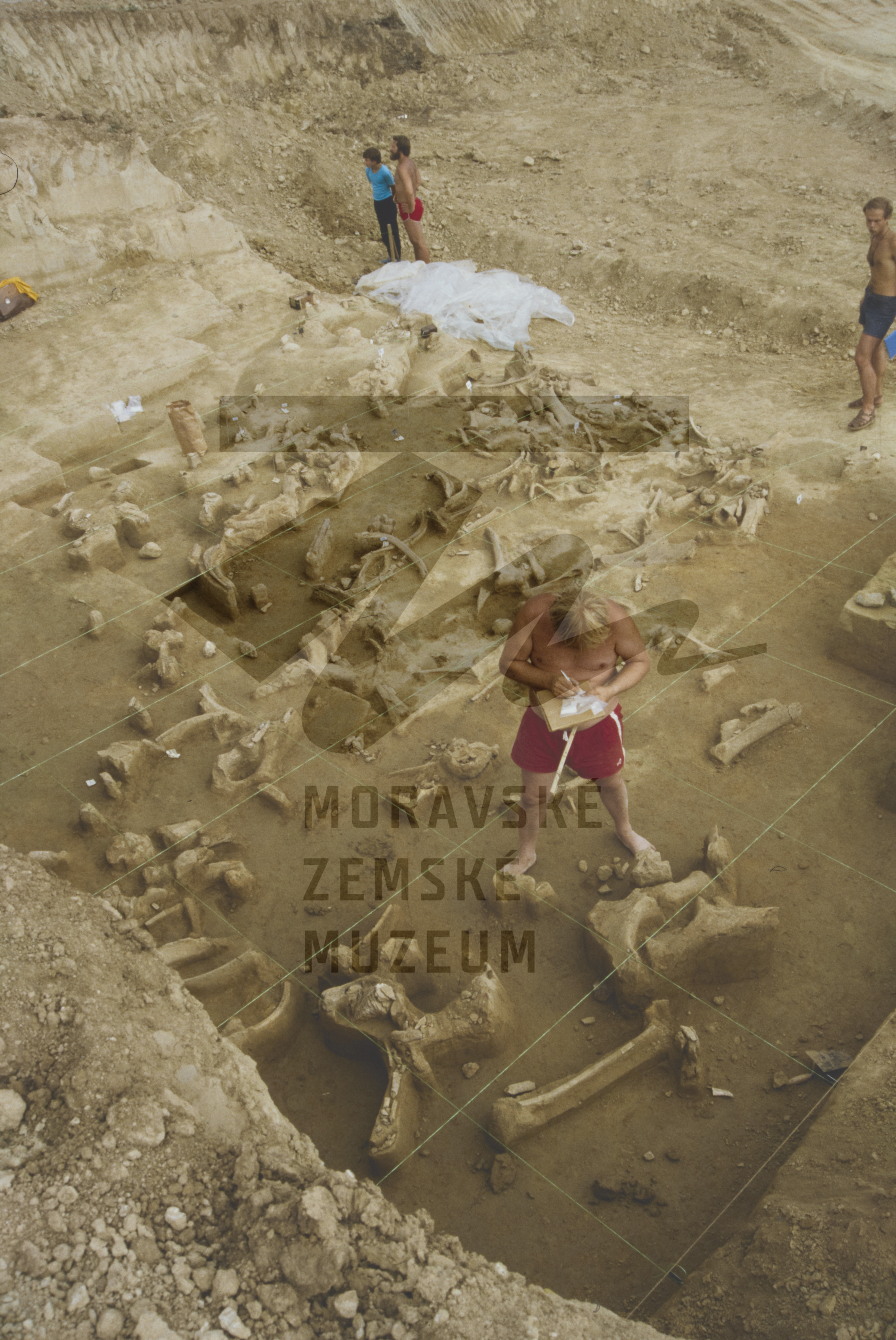 Dokumentace mamutích kostí v gravettienské kulturní vrstvě. V popředí M. Oliva. Vzadu v červených trenýrkách L. Seitl.