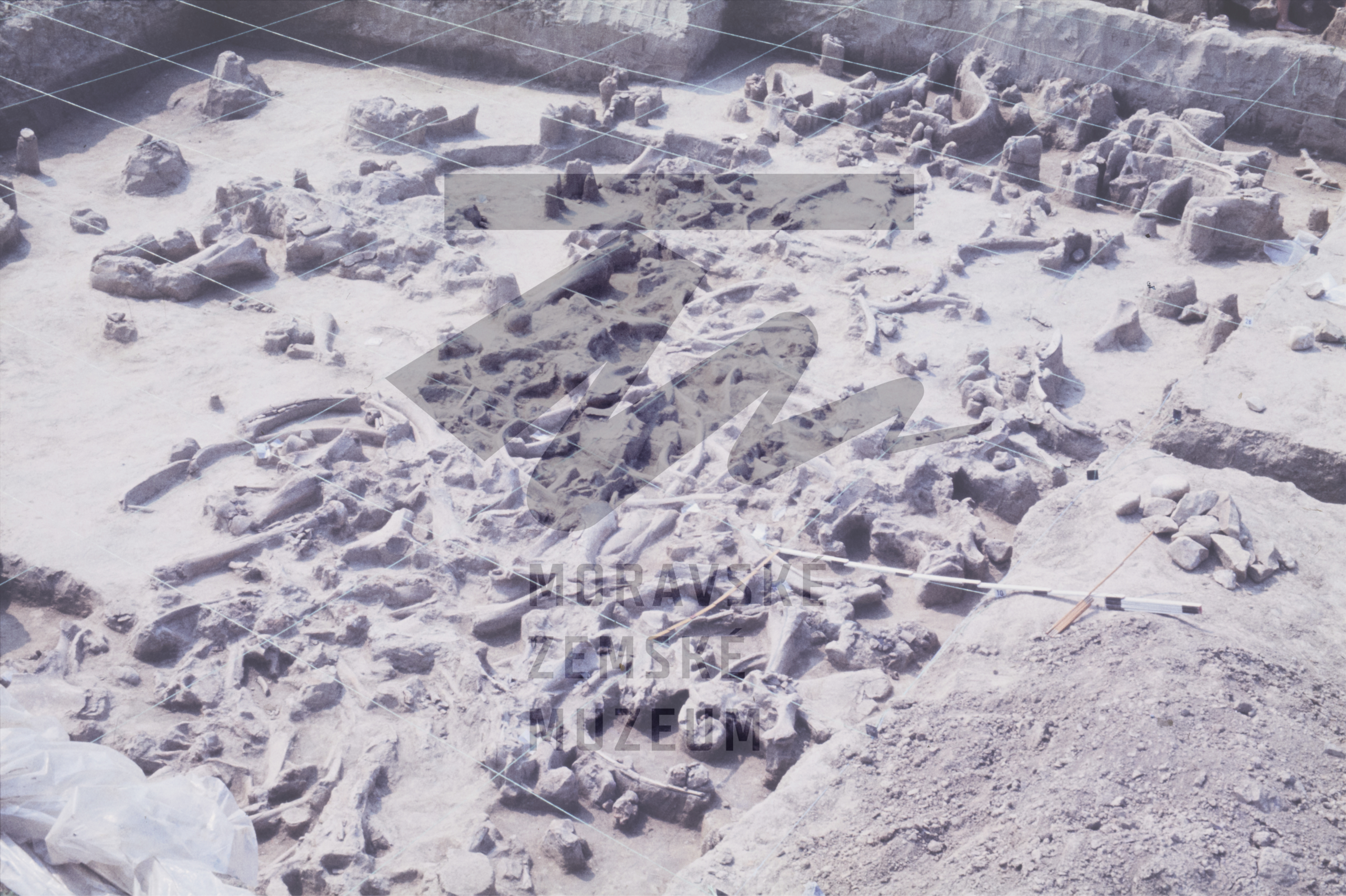 Akumulace mamutích kostí v gravettienské kulturní vrstvě.