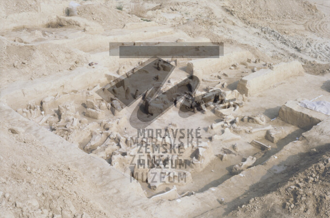 Akumulace mamutích kostí v gravettienské kulturní vrstvě.