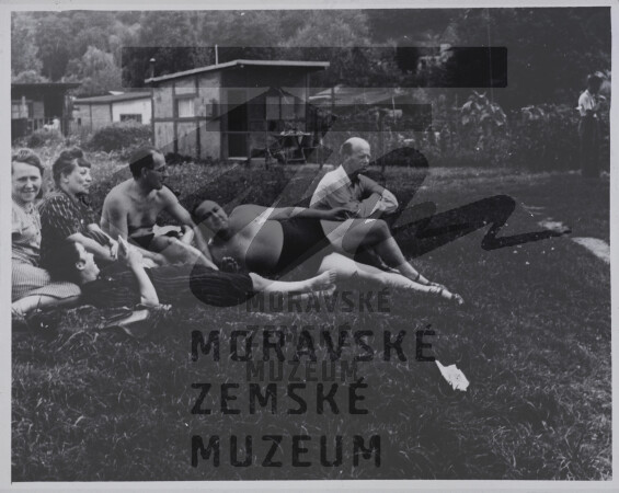 Vítězslav Nezval s J. V. Plevou, malířem Fr. Foltýnem a členy rodiny u Svratky v Jundrově, asi rok 1941